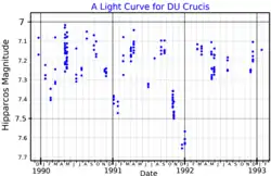 Photometry from the Hipparcos satellite mission showed that DU Crucis varies in brightness with an amplitude of 0.44 magnitudes.[13] No periodicity could be detected in the variations and it was classified as a slow irregular variable of type Lc, indicating a supergiant.[4]