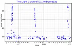 DX Andromedae (often abbreviated to DX And) is a cataclysmic variable star in the constellation Andromeda. It has a typical apparent visual magnitude of 15.5 during the quiescent phase, but becomes brighter (up to a magnitude of 11.0) during outbursts recurring with a mean cycle length of 330 days,[7] thus is classified as a dwarf nova of the SS Cygni type.[3]
