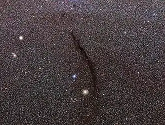This cloud consists of regions of dense gas and dust, and is one of the closest star forming regions to the Solar System.[2] It was described in Sky & Telescope as one of the finest dark nebulae—one that is "wonderful, winding, and very definite".[3] Just to the east of the southern end of the Dark Doodad is NGC 4372.[3] It has also been called the Musca nebula and grouped as the Musca-Chamaeleonis Molecular Cloud.[4]