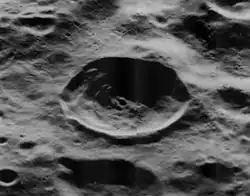 This crater has a sharp-edged rim that is not overlaid by any craters of note. It is roughly circular in shape, with slight bulges to the west and northwest. The inner walls have slumped toward the uneven interior floor, leaving a steeper slope near the rim.