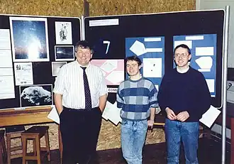 Hughes (left) and his research students James Boswell and Neil McBride at the research bazaar 1991