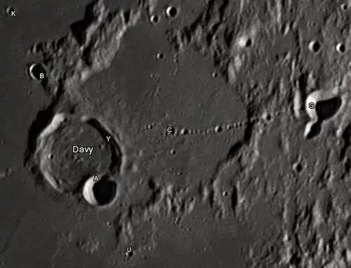 Davy is a small lunar impact crater that is located on the eastern edge of the Mare Nubium. It was named after British physicist Humphry Davy.[2] It overlies the lava-flooded remains of the satellite crater Davy Y to the east, a formation which contains a crater chain designated Catena Davy. To the southeast of Davy is the prominent crater Alphonsus.