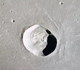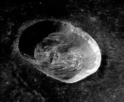 Detailed examination of this crater has located what appear to be alcoves and channels along the inner rim. It is hypothesized that micrometeorite impacts along the rim trigger dry landslides, which produce a gully-like appearance. A similar phenomenon may be responsible for gully-like features along the inner rim of some Martian craters.[2]