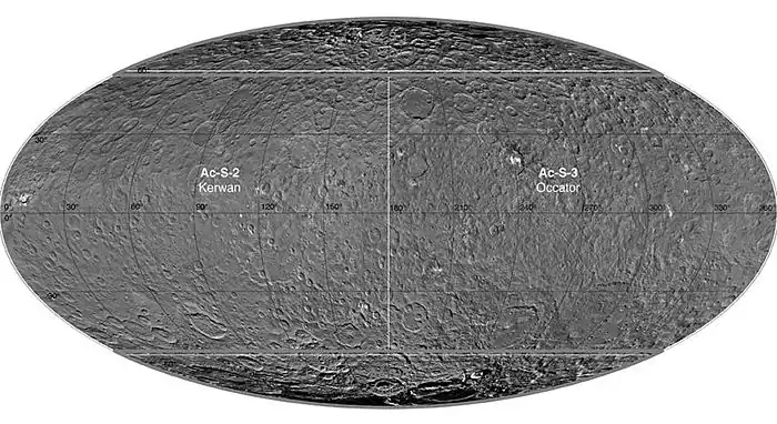 - ↑ Lakdawalla, Emily (March 19, 2015). "LPSC 2015: First results from Dawn at Ceres: provisional place names and possible plumes". The Planetary Society. Retrieved March 21, 2015.