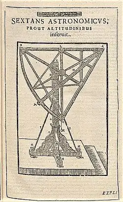 The instruments he had used in Uraniborg and Stjerneborg were depicted and described in detail in his star catalogue Astronomiae instauratae mechanica or Instruments for the restoration of astronomy, first published in 1598. The King sent two envoys to Hven to describe the instruments left behind by Tycho. Unversed in astronomy, the envoys reported to the king that the large mechanical contraptions such as his large quadrant and sextant were "useless and even harmful".[55][56]