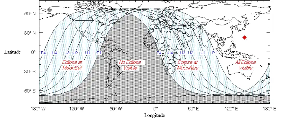 The eclipse was completely visible over east and northern Asia, Australia, and northern North America, seen rising over Europe and east and central Africa, and setting over North America.[3]