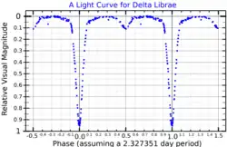 δ Librae is approximately 350 light years from the Earth and the primary, component A, belongs to the spectral class B9.5V, indicating it is a B-type main-sequence star. It is visible to the naked eye with an apparent visual magnitude of 4.93[3] and is moving closer to the Sun with a radial velocity of −39 km/s.[7] This is an Algol-like eclipsing binary star system, with a period of 2.3274 days and an eccentricity of 0.07.[10] Its apparent magnitude varies from 4.91 to 5.90.[15] The secondary is filling its Roche lobe and there is evidence of large-scale mass transfer in the past, with the secondary being more evolved than the primary despite now being less massive.[10]
