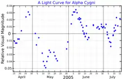 - 1 2 Richardson, N. D.; Morrison, N. D.; Kryukova, E. E.; Adelman, S. J. (2011). "A Five-year Spectroscopic and Photometric Campaign on the Prototypical α Cygni Variable and A-type Supergiant Star Deneb". The Astronomical Journal. 141 (1): 17. arXiv:1009.5994. Bibcode:2011AJ....141...17R. doi:10.1088/0004-6256/141/1/17. S2CID 118300333.