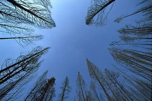 This diffused skylight, owing to its intrinsic nature, can illuminate under-canopy leaves permitting more efficient total whole-plant photosynthesis than would otherwise be the case,[2][14] and also increasing evaporative cooling, from vegetated surfaces.[23] In stark contrast, for totally clear skies and the direct sunlight that results from it, shadows are cast onto understorey leaves, limiting plant photosynthesis to the top canopy layer.[2][14] This increase in global agriculture from the volcanic haze layer also naturally results as a product of other aerosols that are not emitted by volcanoes, such, "moderately thick smoke loading" pollution, as the same mechanism, the "aerosol direct radiative effect" is behind both.[16][24][25]