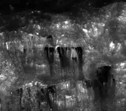 High-resolution view of dark streaks in the wall of Diophantus, showing downslope movement of buried subsurface deposits.