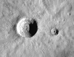 The craters Delisle (above) and Diophantus (below) from Apollo 15. Mons Delisle is to the left of Delisle, and Rima Diophantus lies between Delisle and Diophantus. Note also bright rays extending from the tiny crater Samir.