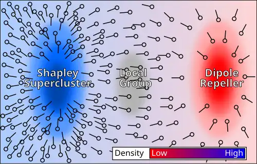 The dipole repeller is a center of effective repulsion in the large-scale flow of galaxies in the neighborhood of the Milky Way, first detected in 2017.[1][2][3] It is thought to represent a large supervoid, the Dipole Repeller Void.[4]