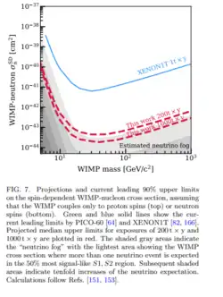 The most recently completed version of the XENON experiment is XENON1T, which used 3.2 tons of liquid xenon. This experiment produced a then record limit for the cross section of WIMP dark matter of 4.1×10−47 cm2 at a mass of 30 GeV/c2.[21] The most recent iteration of the XENON succession is XENONnT, which is currently running with 8 tons of liquid xenon. This experiment is projected to be able to probe WIMP-nucleon cross sections of 1.4×10−48 cm2 for a 50 GeV/c2 WIMP mass.[22] At this ultra-low cross section, interference from the background neutrino flux is predicted to be problematic.