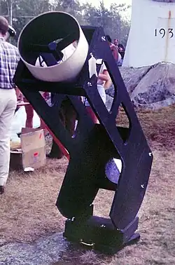 Dobson identified the characteristic features of the design as lightweight objective mirrors made from porthole glass, and mountings constructed from plywood, Teflon strips and other low-cost materials.[4] Since he built these telescopes as aids in his avocation of instructional sidewalk astronomy, he preferred to call the design a "sidewalk telescope".[6] Dobson combined all these innovations in a design focused towards one goal: building a very large, inexpensive, easy to use, portable[7] telescope, one that could bring deep-sky astronomy to the masses.[8]