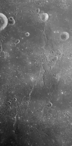 The southern end of the ridge is located near Crozier M crater and southeast of ibn Battuta crater. It trends roughly northeast towards some unnamed craters between Lindbergh and Bilharz craters.
