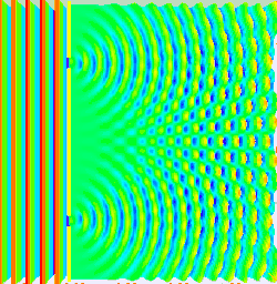 In the double-slit experiment, the two slits are illuminated by the quasi-monochromatic light of a single laser. If the width of the slits is small enough (much less than the wavelength of the laser light), the slits diffract the light into cylindrical waves. These two cylindrical wavefronts are superimposed, and the amplitude, and therefore the intensity, at any point in the combined wavefronts depends on both the magnitude and the phase of the two wavefronts. The difference in phase between the two waves is determined by the difference in the distance travelled by the two waves.