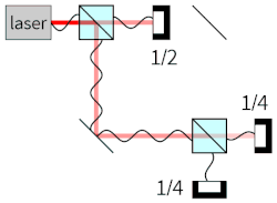 A photon emitted by the laser hits the first beam splitter and is then in a superposition between the two possible paths. In the second beam splitter these paths interfere, causing the photon to hit the photodetector on the right with probability one, and the photodetector on the bottom with probability zero.[46] Blocking one of the paths, or equivalently detecting the presence of a photon on a path eliminates interference between the paths: both photodetectors will be hit with probability 1/2. This indicates that after the first beam splitter the photon does not take one path or another, but rather exists in a quantum superposition of the two paths.[47]