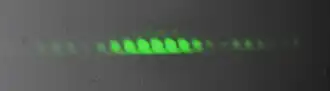 In the basic version of this experiment, a coherent light source, such as a laser beam, illuminates a plate pierced by two parallel slits, and the light passing through the slits is observed on a screen behind the plate.[8][9] The wave nature of light causes the light waves passing through the two slits to interfere, producing bright and dark bands on the screen – a result that would not be expected if light consisted of classical particles.[8][10] However, the light is always found to be absorbed at the screen at discrete points, as individual particles (not waves); the interference pattern appears via the varying density of these particle hits on the screen.[11] Furthermore, versions of the experiment that include detectors at the slits find that each detected photon passes through one slit (as would a classical particle), and not through both slits (as would a wave).[12][13][14][15][16] However, such experiments demonstrate that particles do not form the interference pattern if one detects which slit they pass through. These results demonstrate the principle of wave–particle duality.[17][18]