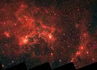 The Dragonfish Nebula, as it is known for its appearance on infrared images, is a massive emission nebula and star-forming region 30,000 light-years from the Sun in the direction of the constellation Crux, the Southern Cross.[3]