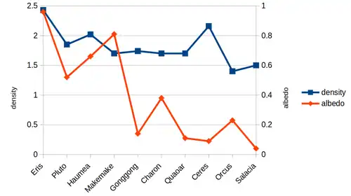 Salacia was later found to have a somewhat higher density, comparable within uncertainties to that of Orcus, though still with a very dark surface. Despite this determination, Grundy et al. call it "dwarf-planet sized", while calling Orcus a dwarf planet.[76] Later studies on Varda suggest that its density may also be high, though a low density could not be excluded.[77]