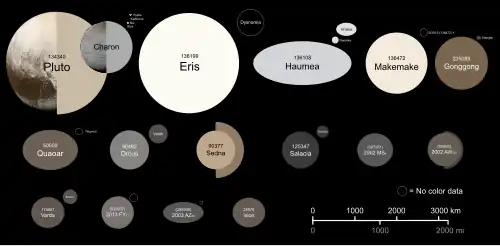 - ↑ Of bodies smaller than 900 km in diameter, the only ones thought to have albedos much greater than this are fragments in the Haumea collisional family and possibly 2005 QU182 (albedo between 0.2 and 0.5).