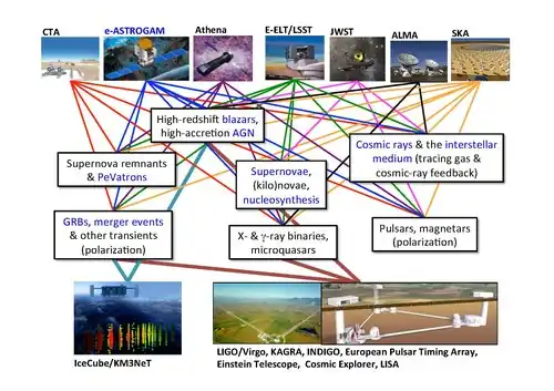 The mission will provide unique data of significant interest to a broad astronomical community, complementary to powerful observatories such as LIGO-Virgo-GEO600-KAGRA, SKA, ALMA, E-ELT, TMT, LSST, JWST, Athena, CTA, IceCube, KM3N, LISA.[4] It will sample the right energies to explore the highest-energy electromagnetic counterparts of gravitational wave events, localizing possible corresponding gamma-ray bursts.