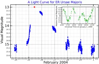 ![]() A visual band light curve for ER Ursae Majoris. The main plot shows a normal outburst in 2004, with the estimated value for the unobserved maximum plotted in red. The inset plot shows superhump oscillations. Adapted from Zhao et al. (2006).[1] | |