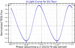 A study of the light curve of this and other cepheids in 1981 showed it belongs to a small group with unusually short periods and distinctive behavior. This indicated that EU Tauri may be a "first overtone" pulsator.[14] Gieren and J. M. Matthews in 1987 suggested that the star may instead have two pulsation periods, but this was later refuted. The evidence now mostly supports the idea that the pulsation of the star is in a "radial first overtone mode". The 1% radius variation during a pulsation cycle is relatively small for a star of this class.[6] By 2007, scattered observations over a 35-year time frame indicated that the pulsation period of this s-Cepheid may have changed.[15]