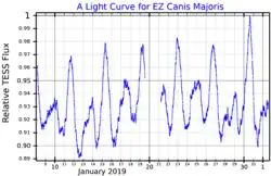 L. W. Ross announced his discovery that the star's brightness varies, in 1961.[9] EZ CMa has an apparent visual magnitude which varies between 6.71 and 6.95 over a period of 3.766 days, along with changes in the spectrum.[10] It has been proposed that it could be a binary star, with a neutron star as companion that would complete an orbit around the Wolf-Rayet with that period, being the cause of those variations. The General Catalogue of Variable Stars lists it as a possible cataclysmic variable on this basis. It has been argued that the companion does not exist and spectral variations are caused by activity on the star's surface.[10]