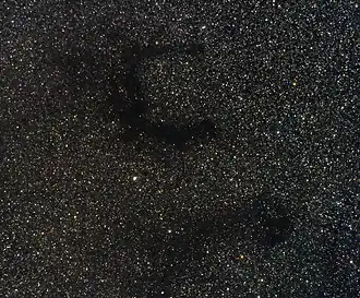 The "E" or "Barnard's E" Nebula (officially designated as Barnard 142 and 143) is a pair of dark nebulae in the Aquila constellation. It is a well-defined dark area on a background of Milky Way consisting of countless stars of all magnitudes, getting its name from its resemblance to the letter E in the Latin alphabet.[1] Its size is about that of the full moon, or roughly 0.5 degrees, and its distance from earth is estimated at 2,000 light years.