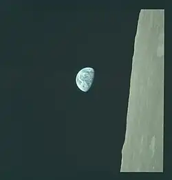 Earthrise is a photograph of Earth and part of the Moon's surface that was taken from lunar orbit by astronaut William Anders on December 24, 1968, during the Apollo 8 mission.[1][2][3] Nature photographer Galen Rowell described it as "the most influential environmental photograph ever taken".[4]