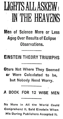 The presentation of the results at the joint 6 November 1919 session of Royal Society and Royal Astronomical Society led to intensive press coverage first in Great Britain and a few days later in the US press, notably in The New York Times, and some days later still in the German press. While Einstein had been a moderately famous public figure in Germany for a few years by that time, the articles in question marked the beginning of his international celebrity status.[25] A notable exception was Belgium, where the Eddington results were given the cold shoulder – partly because Einstein was seen as representing Germany, with the suffering of Belgium in World War I still very present in the country.[26] The sudden popularity of Einstein's theories led to an "Einstein boom" of popular science books.[27]