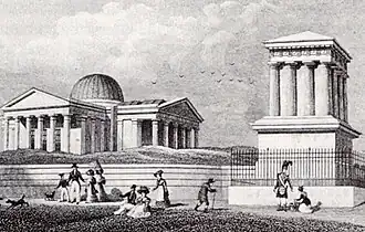 The Edinburgh Astronomical Institution was founded in 1811[1] and wound up in 1847. It was instrumental in the foundation of the Royal Observatory, Edinburgh in 1822.[2] The Institution raised funds, mostly by member subscription, to create three departments: A scientific observatory with an observer was to be under the control of the professors of mathematics, philosophy and astronomy of the University of Edinburgh, a popular observatory was to provide general instruction and amusement and a "physical cabinet" would comprise books, globes, meteorological and other instruments.