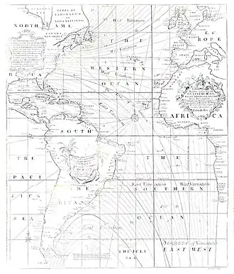 In 1698, at the behest of King William III, Halley was given command of the Paramour, a 52 feet (16 m) pink, so that he could carry out investigations in the South Atlantic into the laws governing the variation of the compass, as well as to refine the coordinates of the English colonies in the Americas.[47] On 19 August 1698, he took command of the ship and, in November 1698, sailed on what was the first purely scientific voyage by an English naval vessel. Unfortunately problems of insubordination arose over questions of Halley's competence to command a vessel. Halley returned the ship to England to proceed against officers in July 1699. The result was a mild rebuke for his men, and dissatisfaction for Halley, who felt the court had been too lenient.[48] Halley thereafter received a temporary commission as a captain in the Royal Navy, recommissioned the Paramour on 24 August 1699 and sailed again in September 1699 to make extensive observations on the conditions of terrestrial magnetism. This task he accomplished in a second Atlantic voyage which lasted until 6 September 1700, and extended from 52 degrees north to 52 degrees south. The results were published in General Chart of the Variation of the Compass (1701).[9] This was the first such chart to be published and the first on which isogonic, or Halleyan, lines appeared.[12][49] The use of such lines inspired later ideas such as those of isotherms by Alexander von Humboldt in his maps.[50] In 1701, Halley made a third and final voyage on the Paramour to study the tides of the English Channel.[51] In 1702, he was dispatched by Queen Anne on diplomatic missions to other European leaders.[51]