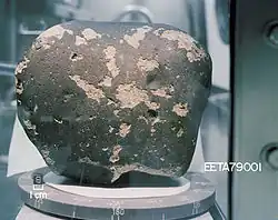 EETA 79001 was discovered at the Elephant Moraine, near Reckling Peak, Victoria Land, Antarctica. It was especially significant due to the fact that it had glass inclusions that were found to contain rare nitrogen isotopic compositions.[4] These same compositions were measured in the Martian atmosphere by the Viking spacecraft in 1976. This match was some of the first crucial evidence to positively identify the EETA 79001 meteorite, and others of its class, to be of Martian origin.[4] EETA 79001 was considered to be proven of Martian origin, after much debate, in 1985 by R.O. Pepin by comparing and expanding findings of the Viking and further isotopic analysis of EETA 79001.[3]