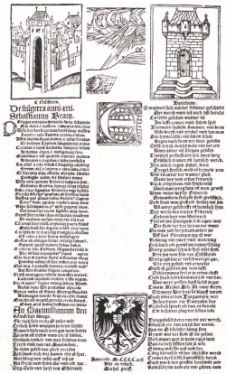 King Maximilian, who was on his way to a campaign against France, ordered for it to be preserved at the local church, "suspended by a chain". He and his advisors decided that the meteorite was a good omen. It was subsequently utilized for propaganda against France. One reason for the quick spreading of the story throughout Europe was the loud volume of the meteorite impact (contemporaries reportedly heard the sound at least 100 miles away). Another reason was the use of broadsheets with dramatic pictures under the direction of the poet Sebastian Brandt (1458–1521).[4][5][6] Brandt, a satirist and author of Das Narrenschiff described the meteorite and its fall in the poem "Loose Leaves Concerning the Fall of the Meteorite".[3] The fall is also described in Folio 257 of the Nuremberg Chronicle.[7] Brandt created broadsheets in Latin and German with a poem describing it as an omen for the king's success in battles against France.[7]
