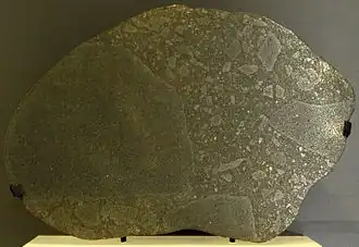 ![]() Section of the Abee meteorite, an enstatite chondrite, on display at the Royal Ontario Museum | |