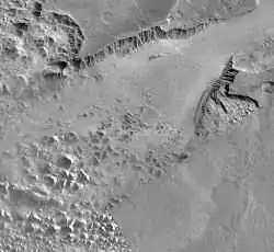 Eos Chaos—lies at southern edge of Eos Chasma, as seen by HiRISE. To see many fine layers click on image.