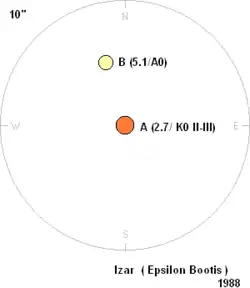Epsilon Boötis (ε Boötis, abbreviated Epsilon Boo, ε Boo), officially named Izar (/ˈaɪzɑːr/ EYE-zar),[18] is a binary star in the northern constellation of Boötes. The star system can be viewed with the unaided eye at night, but resolving the pair with a small telescope is challenging; an aperture of 76 mm (3.0 in) or greater is required.[19]