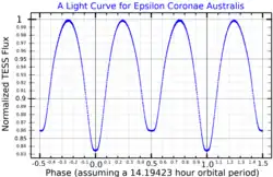 Epsilon Coronae Australis is an F4V dwarf star with an effective temperature of 6000 Kelvin. It ranges between apparent magnitudes of 4.74 to 5 over 14 hours,[10] an absolute magnitude of +2.45, and a mass of 1.1 solar masses. Epsilon Coronae Australis is a W Ursae Majoris variable, indicating that it has a contact companion within the Roche limit of the primary. The star is located at a distance of 30 pc (97 light years) from the Sun.[7] Yildiz and colleagues estimated the age of the system at 2.83 ± 0.28 billion years based on study of the properties of the system and estimated rate of mass transfer. They found the current masses of the primary and secondary to be 1.72 ± 0.04 and 0.22 ± 0.02 solar masses respectively, from their original masses of 1.06 ± 0.03 and 2.18 ± 0.06 solar masses.[11]