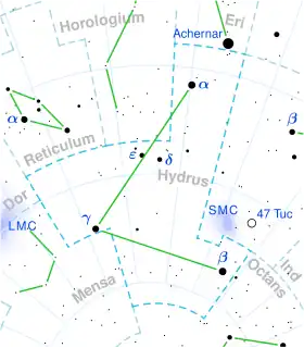 | ε Hyi, CPD−68° 161, FK5 95, GC 3240, HD 16978, HIP 12394, HR 806, SAO 248621 | |