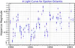 Epsilon Octantis was found to be variable on a survey of the southern sky conducted by the Bamberg observatory, which was reported in 1966.[10] In 1972, it was assigned the variable star designation BO Octantis,[11] although this is now recognised as a mistake since stars with Bayer designations are not given a separate variable star designation.[2]