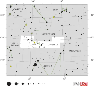 Epsilon Sagittae (ε Sagittae) is a solitary,[7] yellow-hued star in the northern constellation of Sagitta. With an apparent visual magnitude of +5.64 to +5.67,[2] it is faintly visible to the naked eye on a dark night. It is a variable star with a small amplitude of 0.03 magnitudes. Based upon an annual parallax shift of 5.60 mas as seen from Earth,[8] it is located roughly 580 light years from the Sun. At that distance, the visual magnitude of the star is diminished by an extinction factor of 0.1 due to interstellar dust.[3]