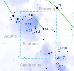 Epsilon Scuti, Latinized from ε Scuti, is a probable astrometric binary [9] star system in the constellation Scutum. It is faintly visible to the naked eye with an apparent visual magnitude of +4.88.[2] Based upon an annual parallax shift of 5.71 mas as seen from Earth,> it is located approximately 570 light years from the Sun. It is moving closer to the Sun with a radial velocity of −9.8 km/s.[6] Epsilon Scuti was a latter designation of 3 Aquilae.[10]