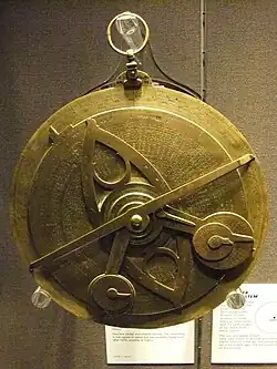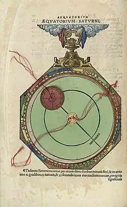 The roots of the equatorium lie in the astrolabe. The history of the astrolabe dates back to roughly 220 BC in the works of Hipparchus.[6] The difference between the two instruments is that the astrolabe measures the time and position of the sun and stars at a specific location in time.[7] In contrast, the equatorium is used to calculate the past or future positions of the planets and celestial bodies according to the planetary theory of Ptolemy.