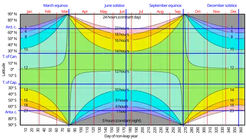 - ↑ Forsythe, William C.; Rykiel, Edward J.; Stahl, Randal S.; Wu, Hsin-i; Schoolfield, Robert M. (1995). "A model comparison for day length as a function of latitude and day of year" (PDF). Ecological Modelling. 80 (1): 87–95. Bibcode:1995EcMod..80...87F. doi:10.1016/0304-3800(94)00034-F.