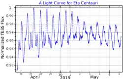 As a Be star,[11] it has variable emissions in its hydrogen spectral lines. This emission can be modelled by a decretion disk of gas that has been ejected from the star by its rapid rotation and now follows a near-Keplerian orbit around the central body.[12] Its brightness is also slightly variable, and it is classified as a Gamma Cassiopeiae variable star with multiple periods of variability.[3] The International Variable Star Index lists Eta Centauri as both a Gamma Cassiopeiae variable and a Lambda Eridani variable with variations caused by its rotation and pulsations.[13]