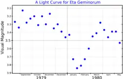 In 1865, Julius Schmidt first reported that η Geminorum was a variable star. The light variations were described by Schmidt and other observers as having long maxima of constant brightness, minima of greatly varying size and shape, and a period around 231 days.[24] The star was classified as both a semiregular variable and an eclipsing variable. The eclipse period has been set at about eight years, corresponding to the orbit of an unseen companion. The eclipses were initially questioned, but special projects led to the eclipses of February 1980, April 1988 and October 2012 being well observed. Eclipses have depths of about half a magnitude and durations of several weeks.[25][23]