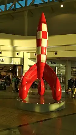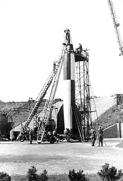 According to literary critics Jean-Marc Lofficier and Randy Lofficier, possible fictional influences on Hergé's story include Jules Verne's 1870 novel Around the Moon and the 1950 American film Destination Moon.[20] Hergé was certainly inspired by a number of photographic stills from the Destination Moon film which had been published.[21] The computer system at the Sprodj space centre was visually based upon the UNIVAC I, the first computer to be created for non-military purposes.[22] Hergé based his Moon rocket on the designs of the V-2 rocket which had been developed by German scientists during World War II.[13] The red-and-white checker pattern on Hergé's rocket was based upon an illustration of a V-2 which Hergé had come upon in Leslie Simon's 1947 book German Research in World War II.[20] He commissioned the construction of a model rocket with detachable parts from his assistant Arthur Van Noeyen. He took the model to Paris where he showed it to Ananoff, asking him if it was a realistic representation of what a Moon rocket might look like. He and his assistants then used the model from which to accurately sketch when producing the comic.[23] Hergé introduced into the story the character of Boris Jorgen, who had previously appeared as an antagonist in King Ottokar's Sceptre (1939).[24] He added evidence for water on the Moon on the advice of Heuvelmans.[25]