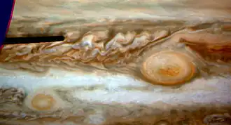 Observations of the Red Spot Jr. storm suggest Jupiter could be in a period of global climate change.[26][27] This is hypothesized to be part of an approximately 70 year global climate cycle, characterized by the relatively rapid forming and subsequent slow erosion and merging of cyclonic and anticyclonic vortices in Jupiter's atmosphere. These vortices facilitate the heat exchange between poles and equator. If they have sufficiently eroded, heat exchange is strongly reduced and regional temperatures may shift by as much as 10 K, with the poles cooling down and the equator region heating up. The resulting large temperature differential destabilizes the atmosphere and thereby leads to the creation of new vortices.[28][29]
